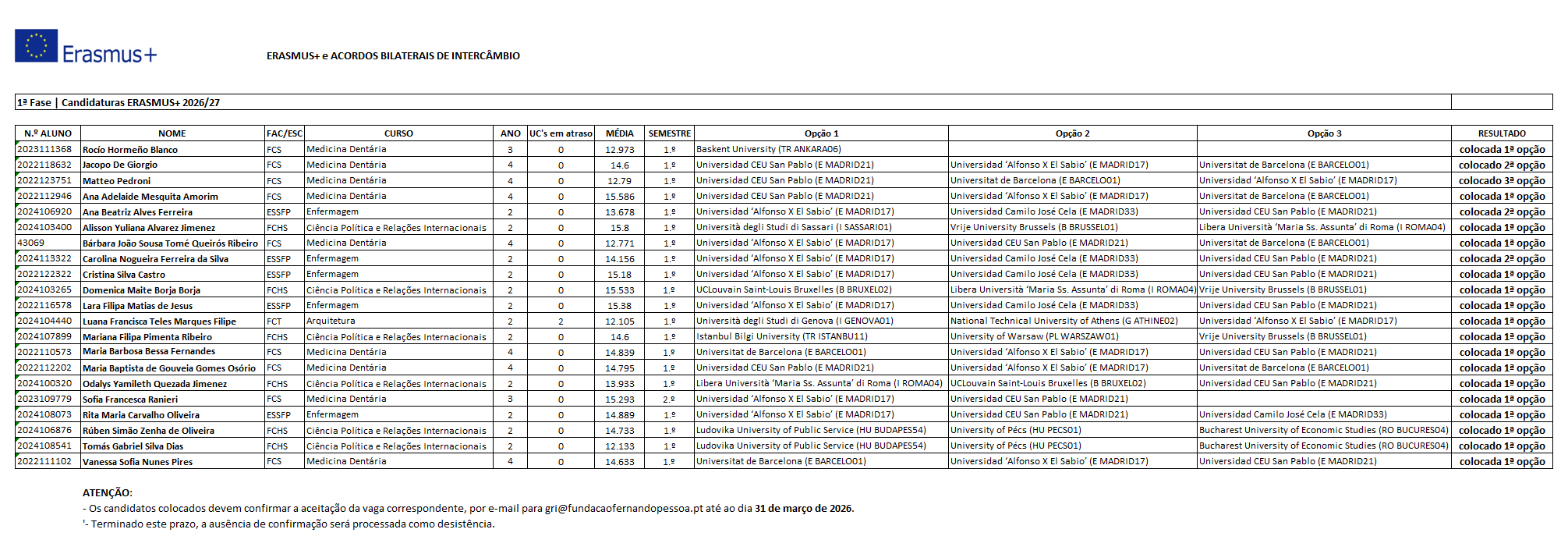 Programa Erasmus+: Resultados em 25 de março de 2026 (1.ª fase).
