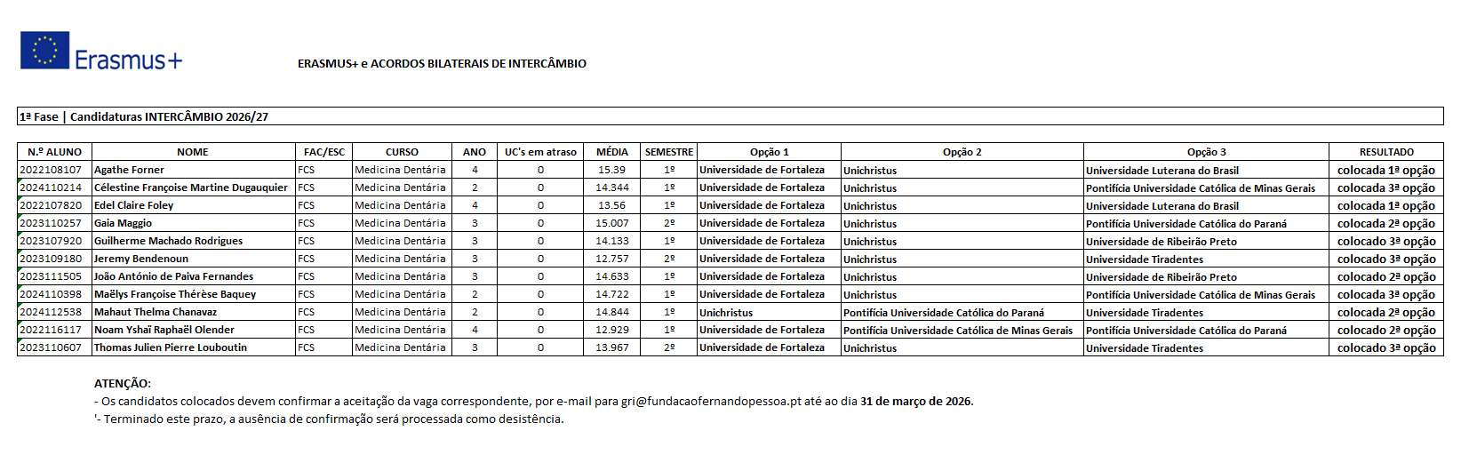 Programa Intercâmbio: Resultados em 25 de março de 2026 (1.ª fase).